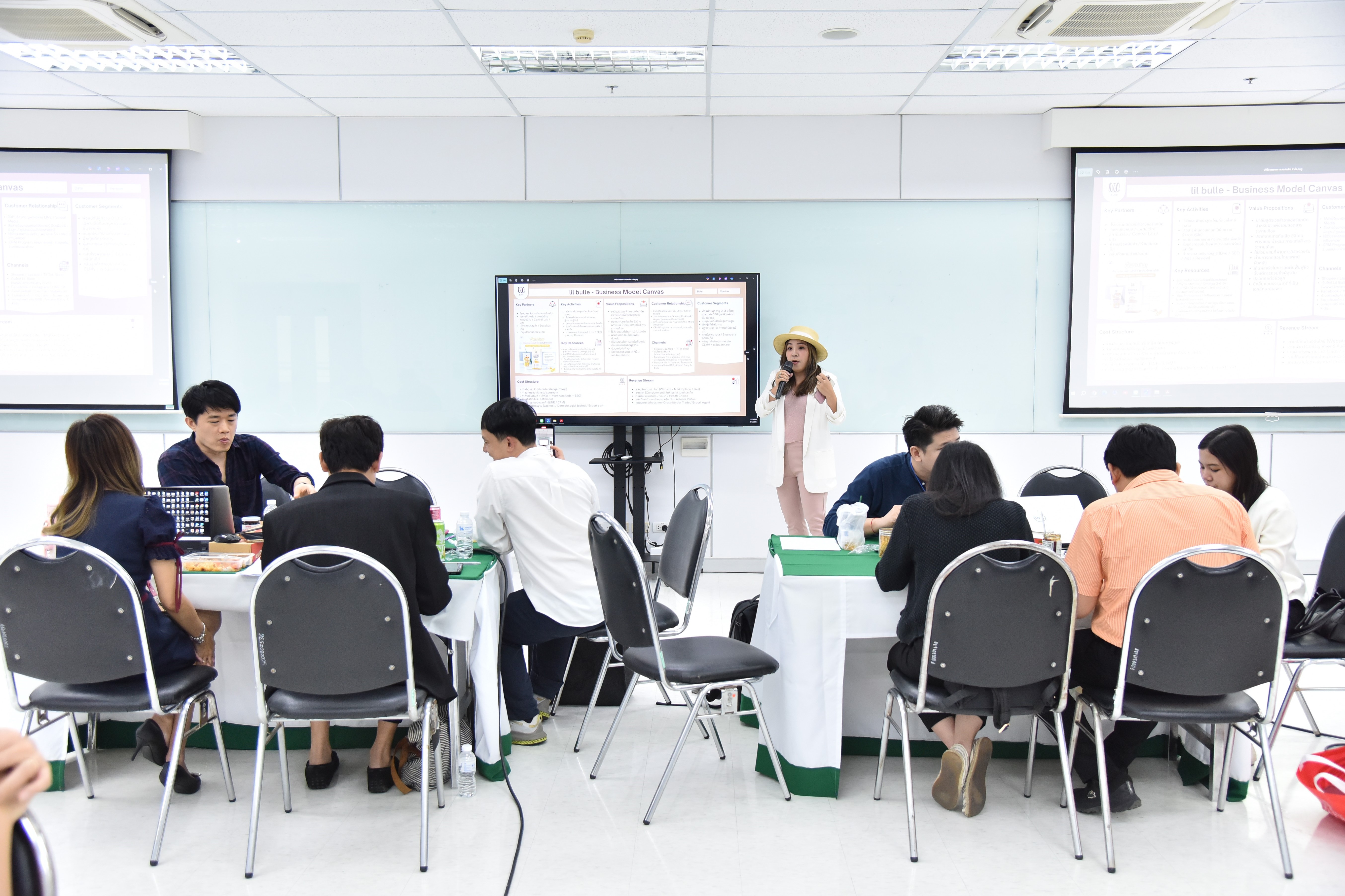 ในช่วงบ่าย ได้มีการให้ผู้ประกอบการได้นำเสนอ Business Model Canvas ของธุรกิจตนเอง ซึ่งแต่ละธุรกิจได้นำเสนอข้อมูลได้อย่างน่าสนใจ พร้อมได้รับฟังข้อเสนอแนะอันเป็นประโยชน์จากคณะอาจารย์ที่ปรึกษา ซึ่งเป็นผู้เชี่ยวชาญในหลากหลายด้าน จากสถาบันการจัดการปัญญาภิวัฒน์ และผู้ประกอบการที่ร่วมนำเสนอ Business Model Canvas ในครั้งนี้ ทำให้เกิดการแลกเปลี่ยนเรียนรู้และสร้างความเข้าใจที่ลึกซึ้งยิ่งขึ้น เพื่อให้ผู้ประกอบการสามารถนำแนวคิดไปปรับใช้กับธุรกิจของตนเองได้อย่างมีประสิทธิภาพสูงสุด