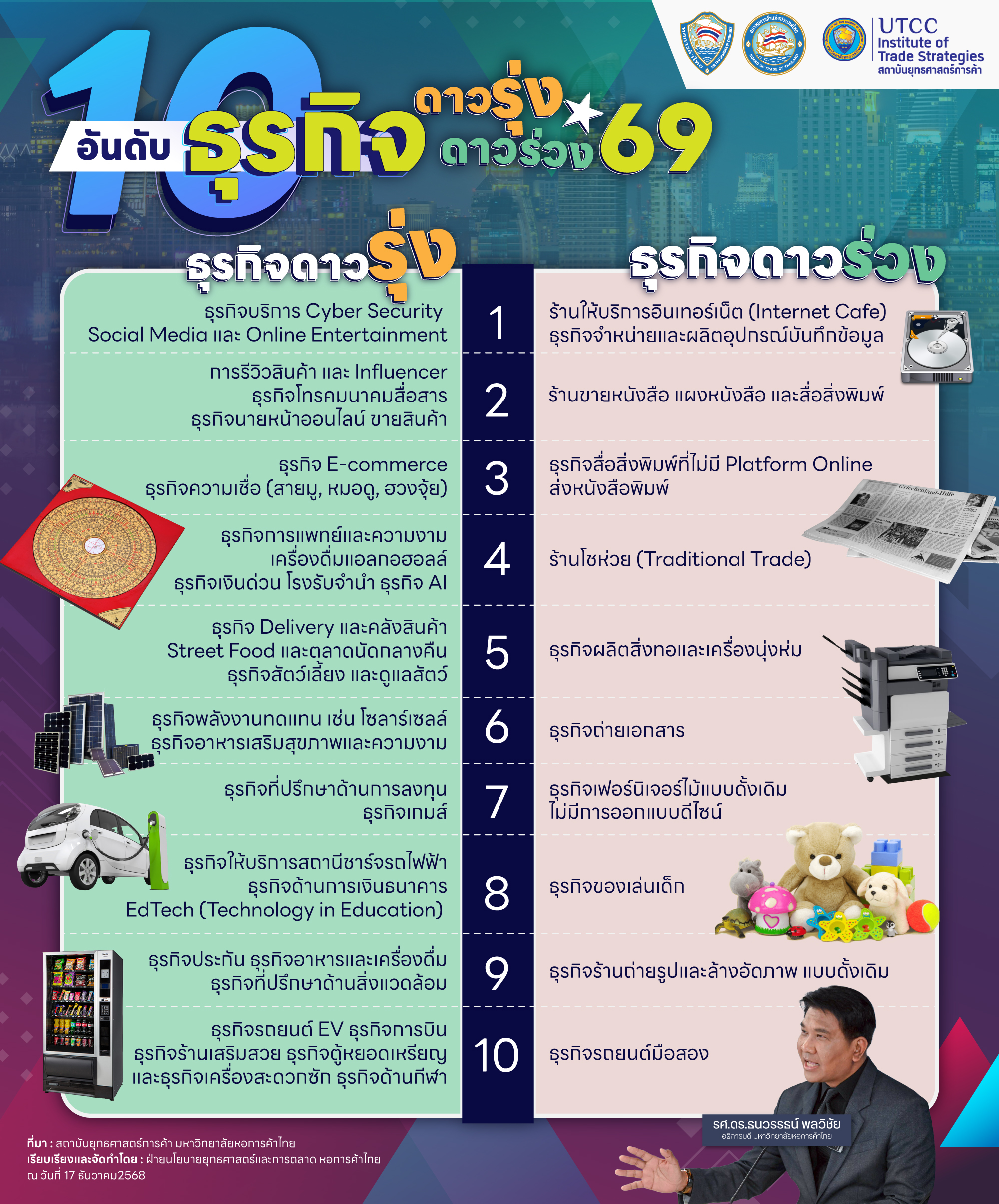 ทั้งนี้ สถาบันยุทธศาสตร์การค้า มหาวิทยาลัยหอการค้าไทย มองว่า การติดตามทิศทาง “ธุรกิจดาวรุ่ง–ดาวร่วง” อย่างใกล้ชิด จะช่วยให้ผู้ประกอบการสามารถวางแผน ปรับกลยุทธ์ และตัดสินใจลงทุนได้อย่างรอบคอบ สอดคล้องกับบริบทเศรษฐกิจไทยและเศรษฐกิจโลกในปี 2569 อย่างมีประสิทธิภาพ