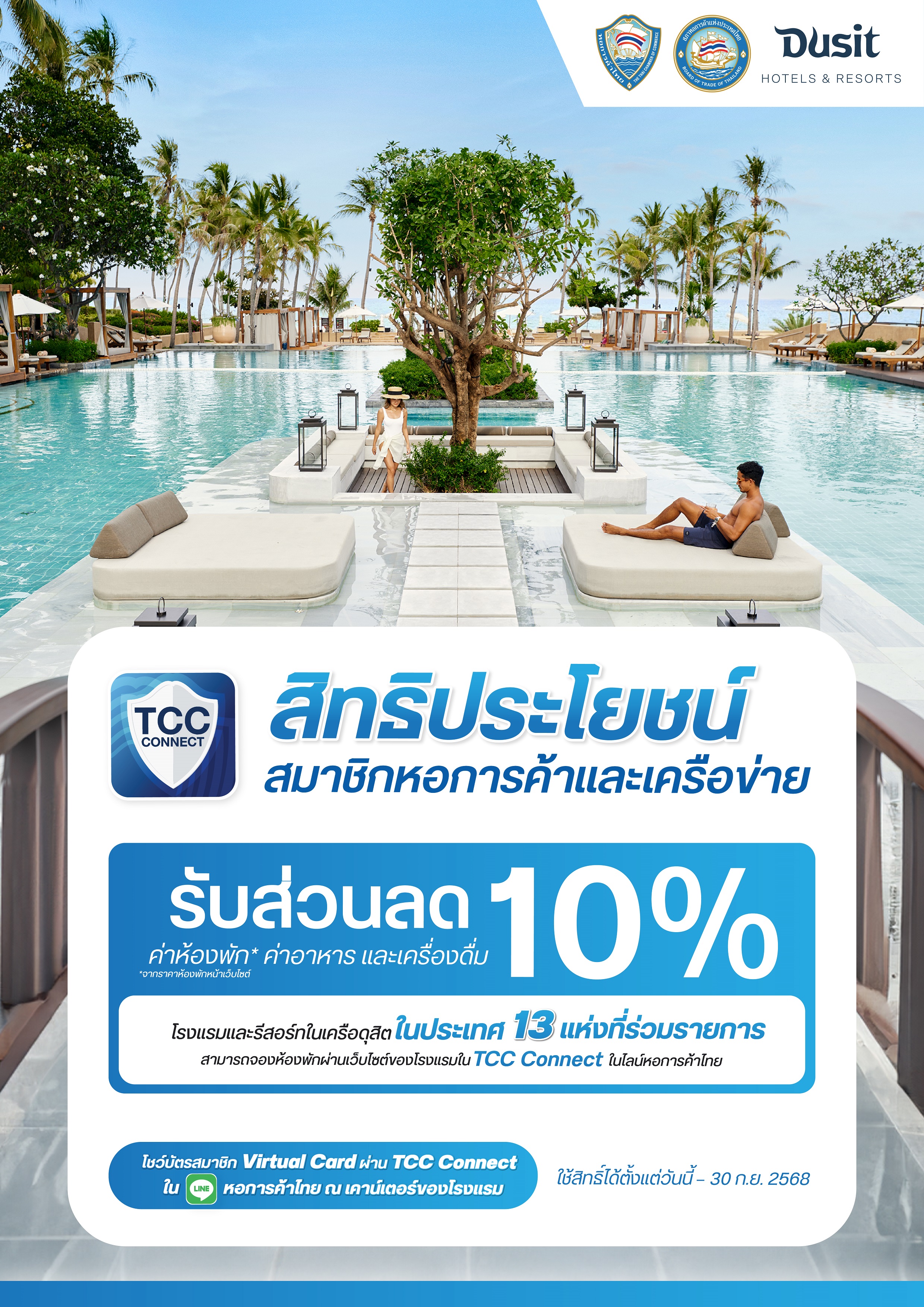 1. สิทธิพิเศษสำหรับสมาชิกหอการค้าไทยเมื่อสำรองห้องพักล่วงหน้าผ่านเว็บ www.dusit.com/specialoffers/TCC หรืออีเมล์ customerservice@dusit.com หรือติดต่อโรงแรมโดยตรง พร้อมระบุรหัสโปรโมชั่น