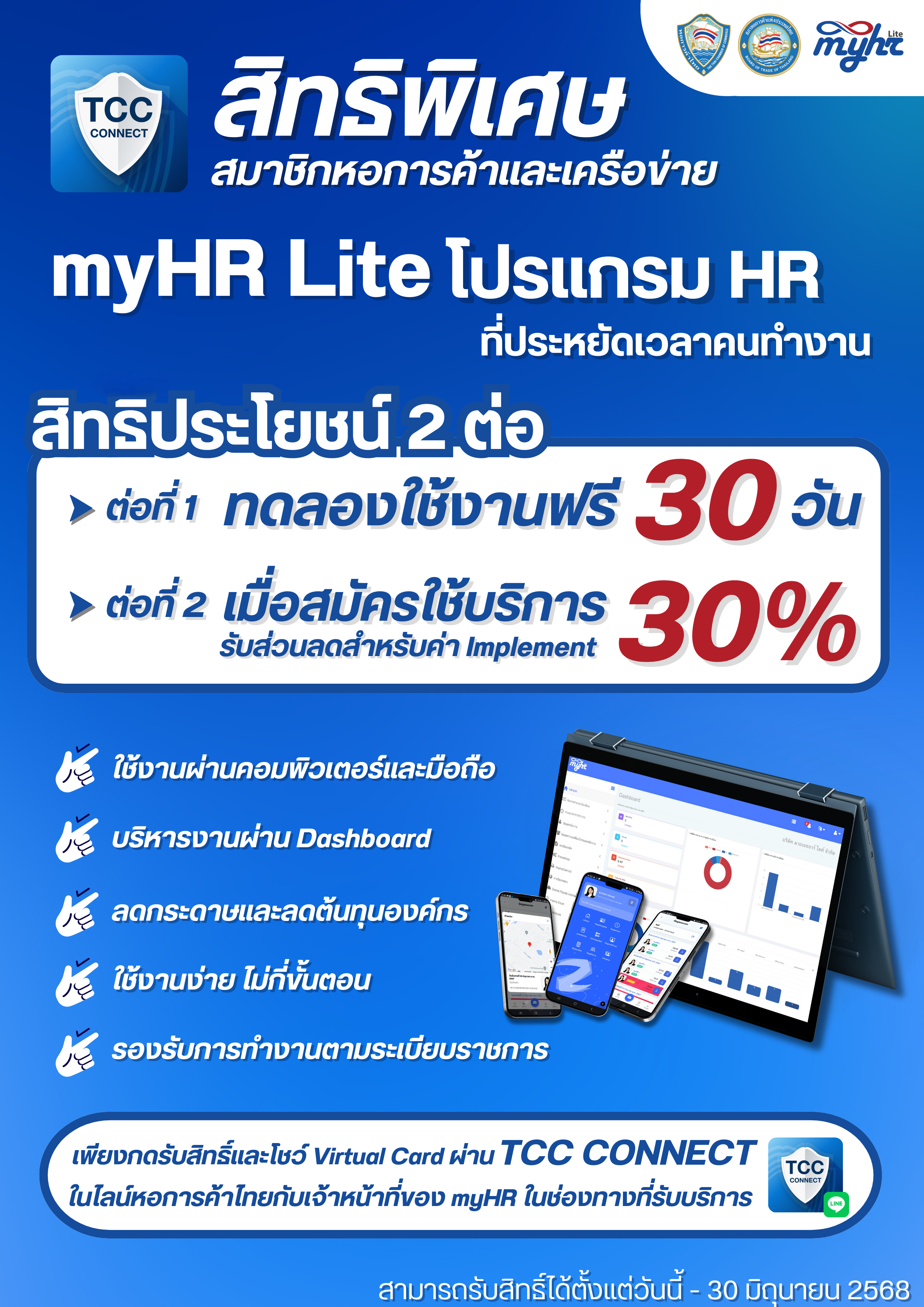กด “รับสิทธิ์” เพื่อโชว์บัตรสมาชิก Virtual Card ผ่าน TCC Connect ในไลน์หอการค้าไทยกับเจ้าหน้าที่ของ myHR Lite ทางช่องทางต่างๆ