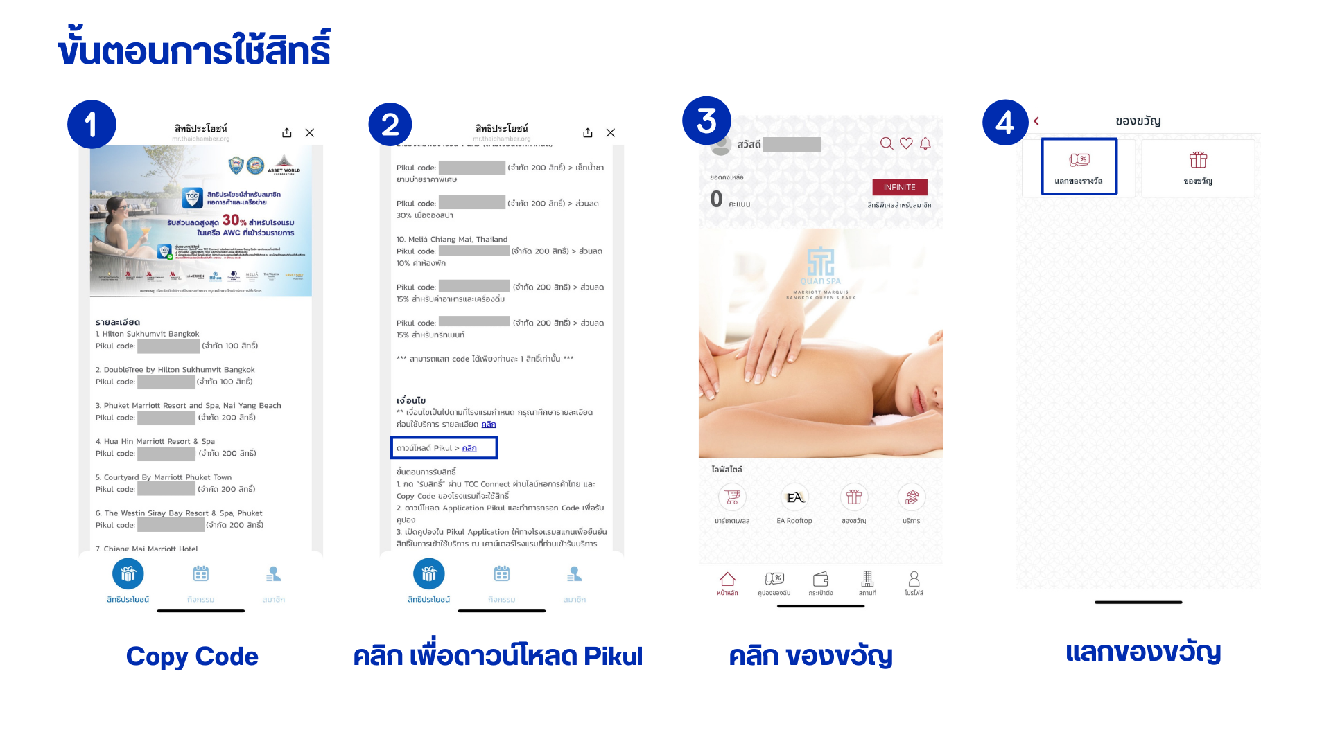 - ทั้งนี้การแลกสิทธิ์ใน Pikul Application ไม่เกี่ยวกับการจองเข้าใช้บริการ หากต้องการเข้าใช้บริการในแต่ละโรงแรมจึงจำเป็นต้องติดต่อทางโรงแรมเพื่อเป็นการสำรองล่วงหน้าก่อนเข้าใช้บริการ