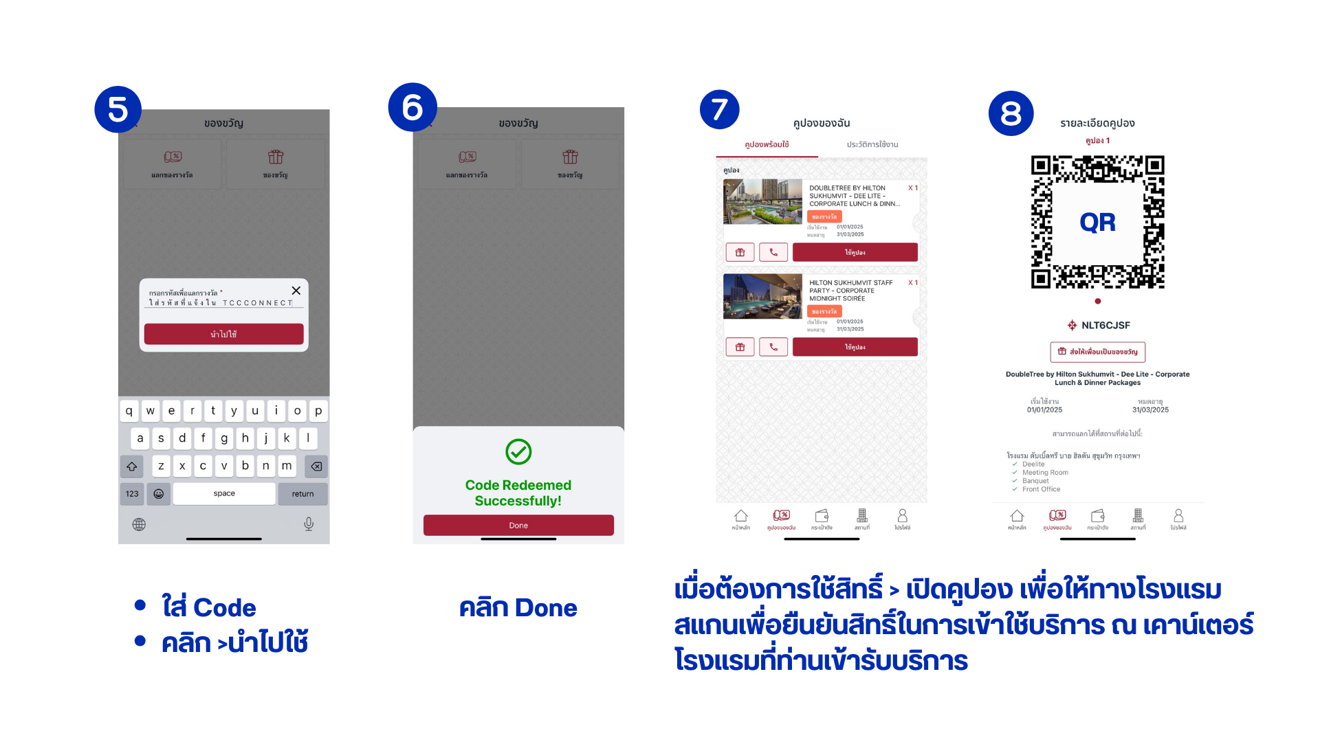 1. กด “รับสิทธิ์” ผ่าน TCC Connect ผ่านไลน์หอการค้าไทย และ Copy Code ของโรงแรมที่จะใช้สิทธิ์