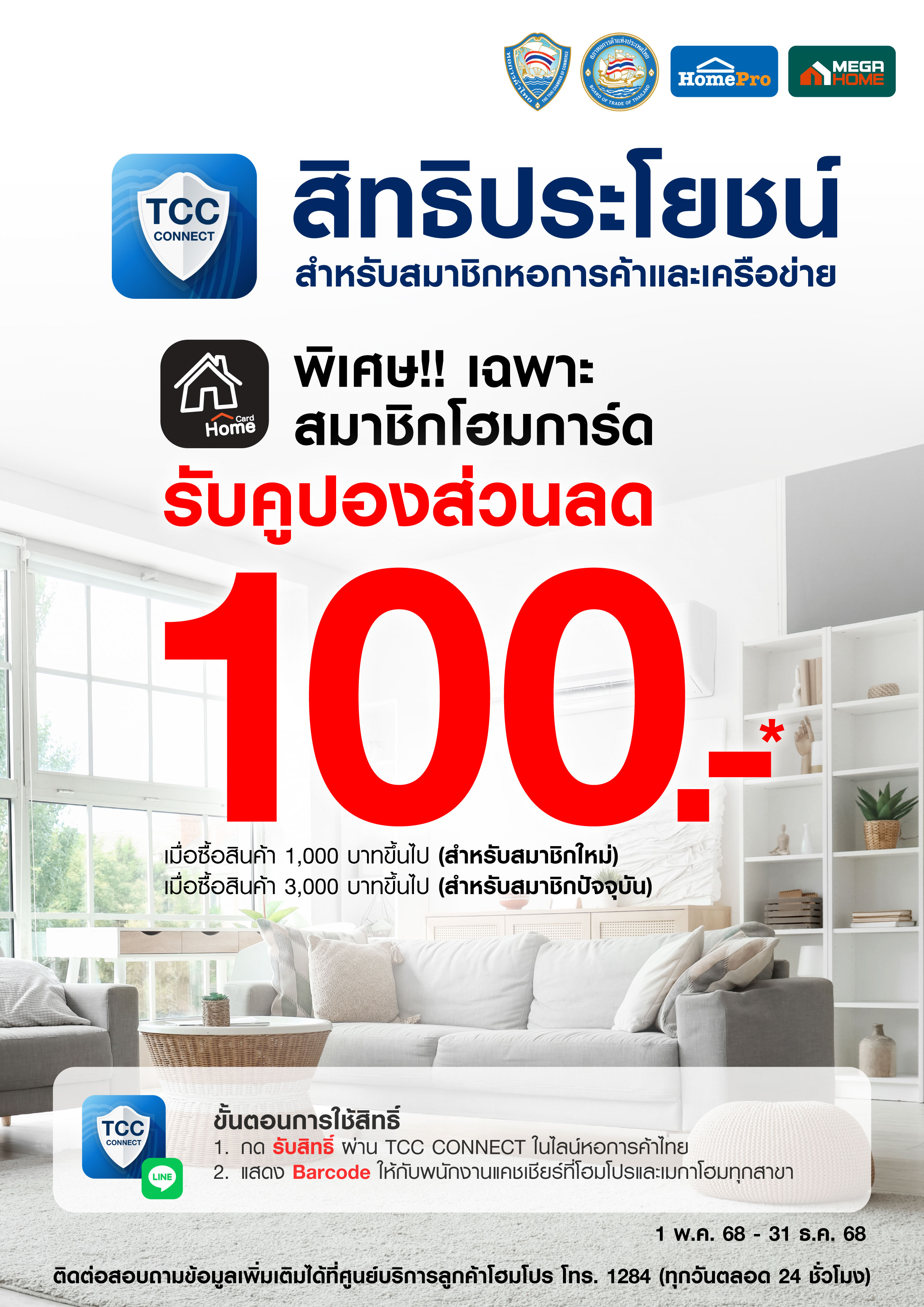 • สามารถใช้คูปองนี้สำหรับการซื้อสินค้าขั้นต่ำ 3,000 บาทขึ้นไป / ใบเสร็จ ที่โฮมโปร, เมกาโฮมทุกสาขา