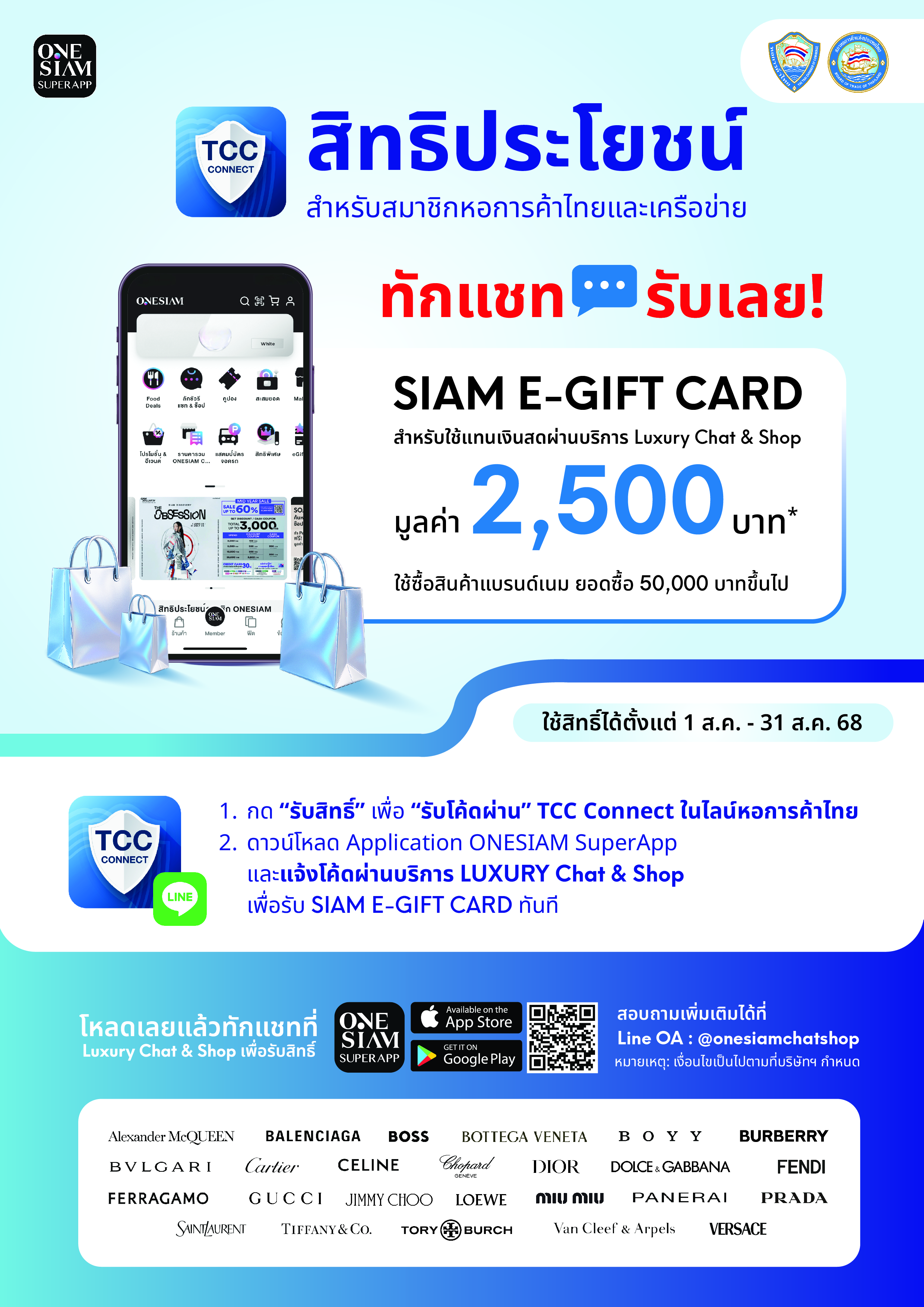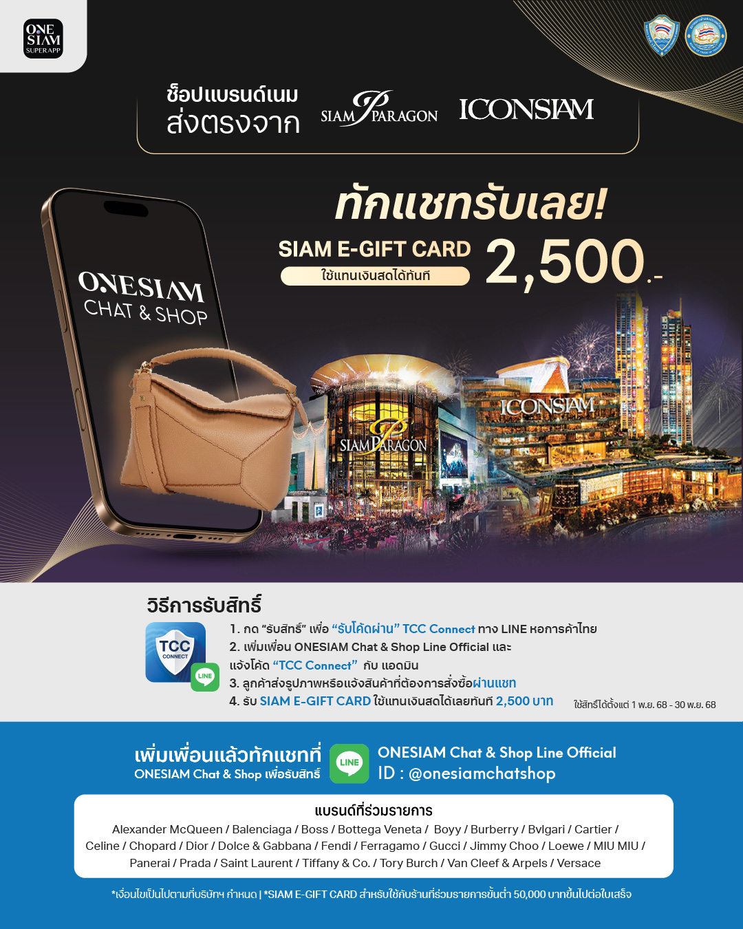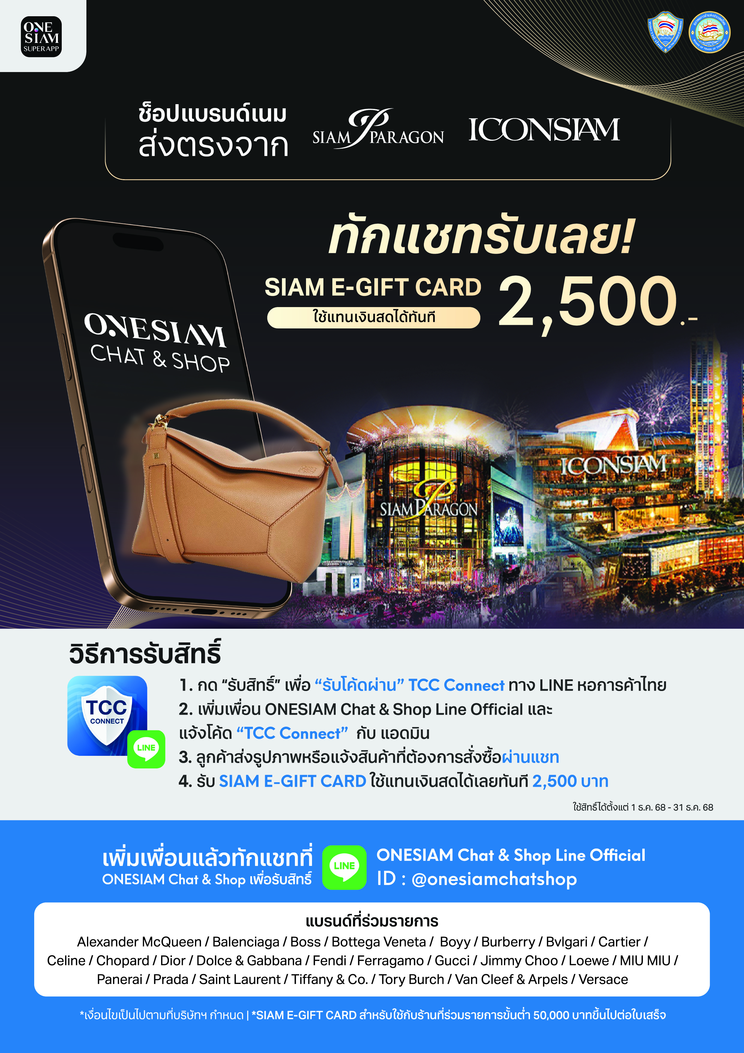 - เมื่อซื้อสินค้า Luxury brand ผ่านช่องทาง LUXURY CHAT&SHOP ใน ONESIAM SuperApp มูลค่า 50,000 บาทขึ้นไป รับ SIAM E-GIFT CARD มูลค่า 2,500 บาท ใช้เป็นส่วนลดแทนเงินสดตั้งแต่บิลแรก