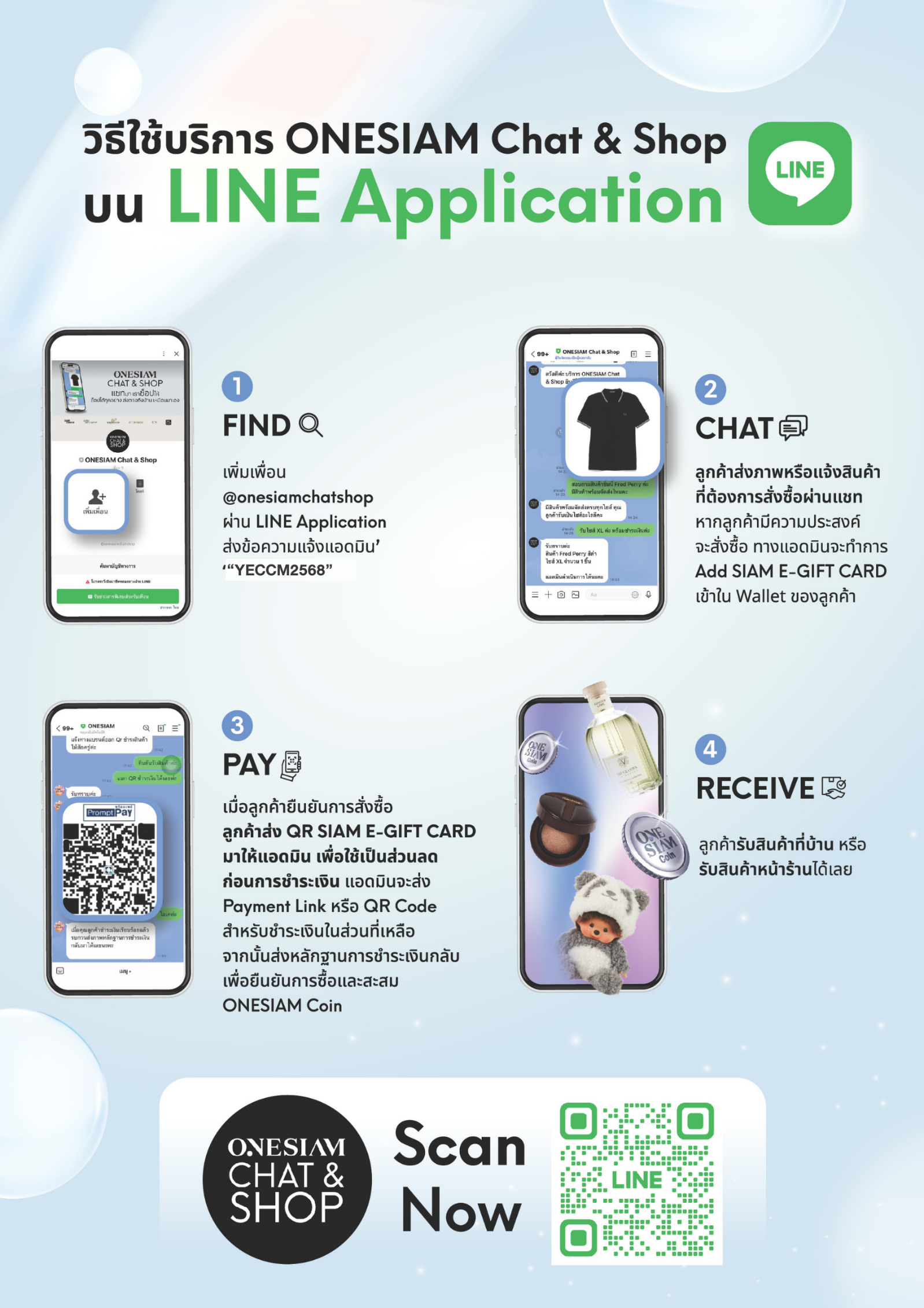 3. เมื่อลูกค้ายืนยันการสั่งซื้อ ลูกค้าส่ง QR SIAM E-GIFT CARD มาให้แอดมิน เพื่อใช้เป็นส่วนลดก่อนการชำระเงิน แอดมินจะส่ง Payment Link หรือ QR Code สำหรับชำระเงินในส่วนที่เหลือ จากนั้นส่งหลักฐานการชำระเงินกลับเพื่อยืนยันการซื้อและสะสม ONESIAM Coin