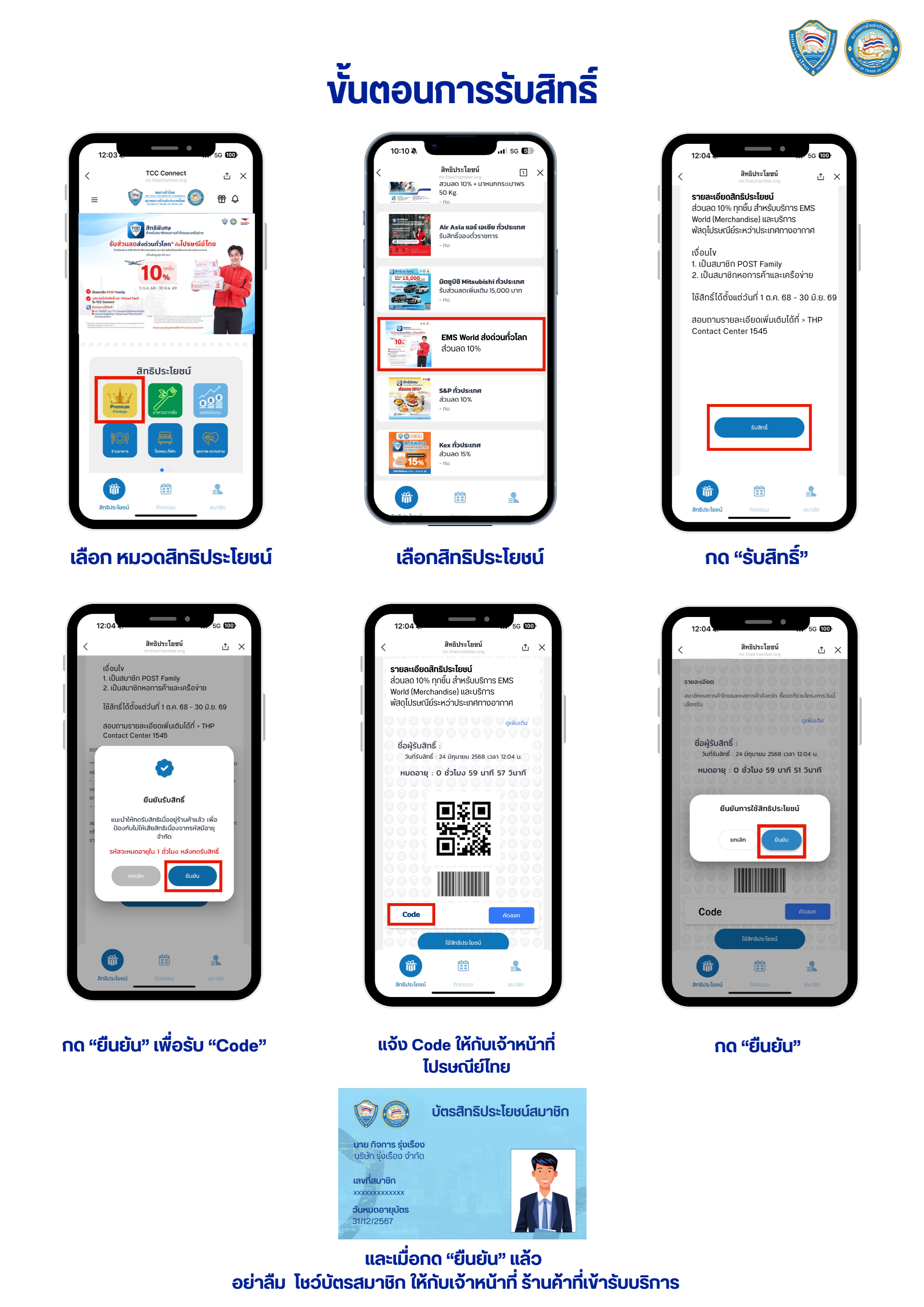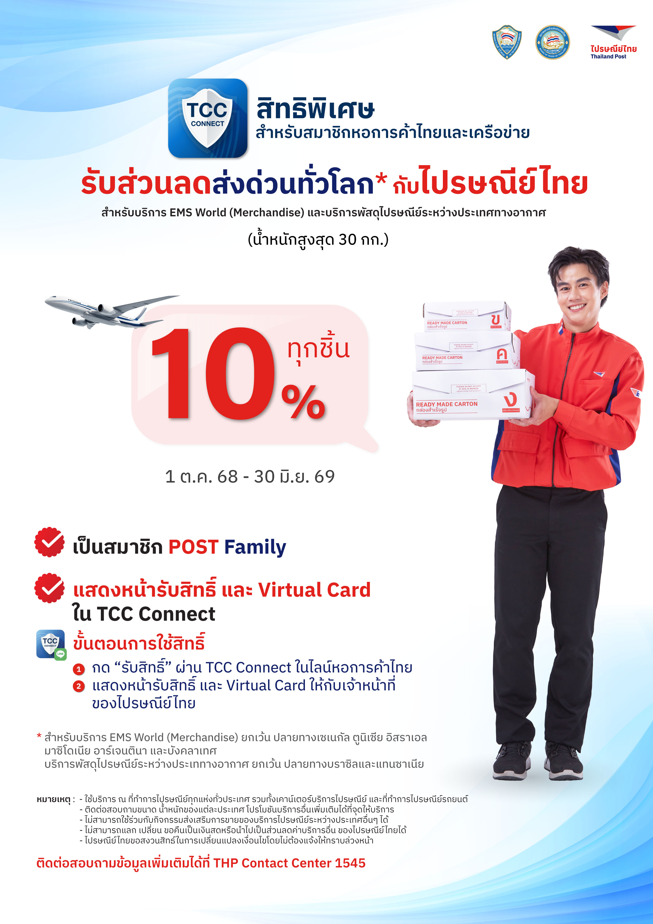- แสดงบัตรสิทธิประโยชน์สมาชิกของหอการค้าไทยและสภาหอการค้าแห่งประเทศไทยและเป็นสมาชิก POST Family