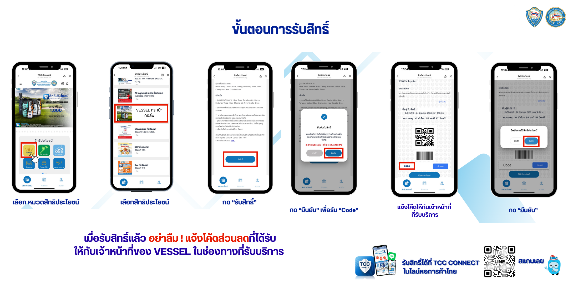 2. แสดงหน้ารับสิทธิ์ Code/Barcode ที่ได้รับ หรือ โชว์บัตรสมาชิก Virtual Card ในไลน์หอการค้าไทย ให้กับเจ้าหน้าที่ของ VESSEL ณ จุดซื้อ TPS Building พัฒนาการ