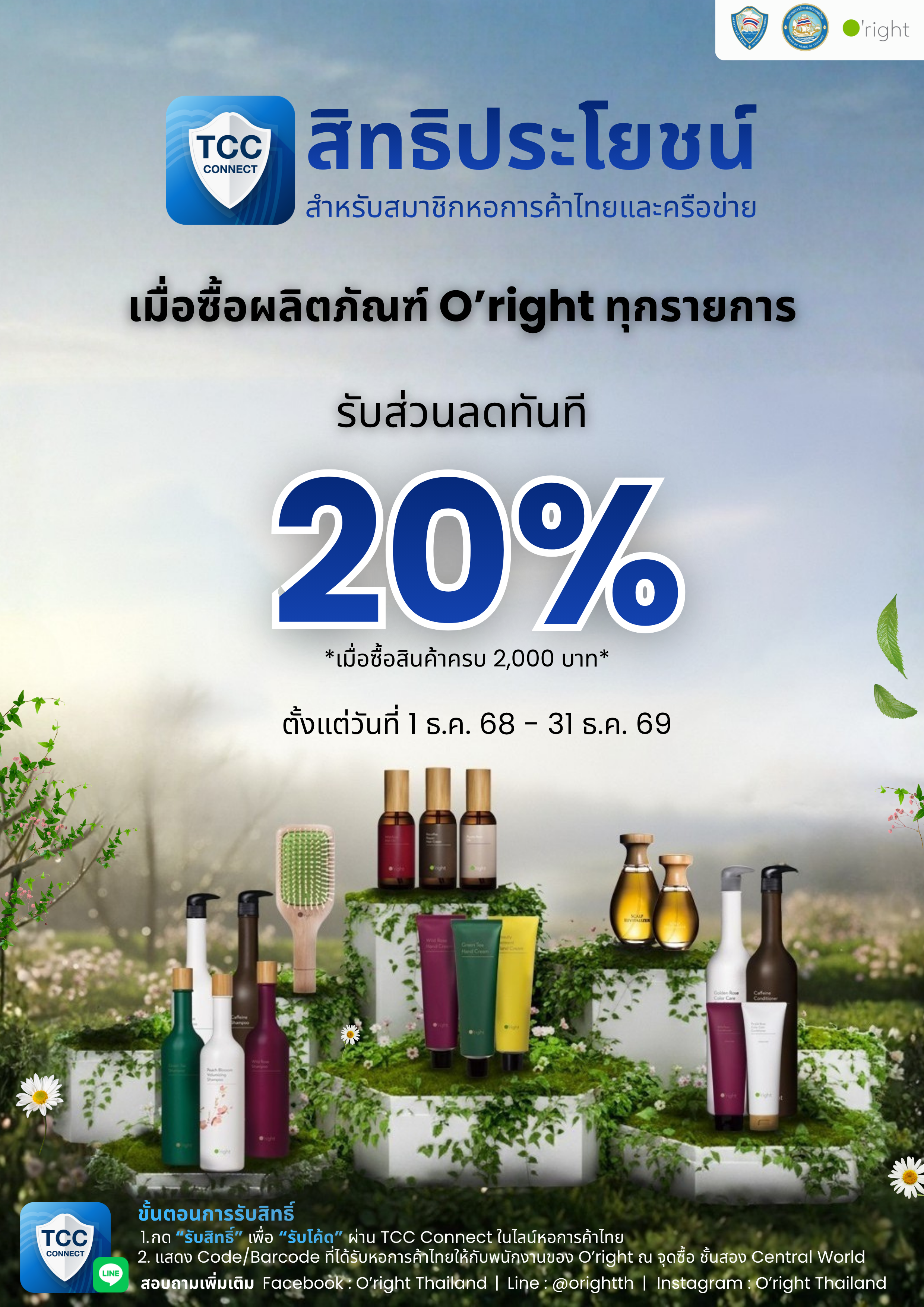 ส่วนลดทันที 20% สาหรับการซื้อผลิตภัณฑ์ O’right ทุกรายการ (ยอดการซื้อขั้นต่า 2,000 บาทไม่จากัดจานวนชิ้น)