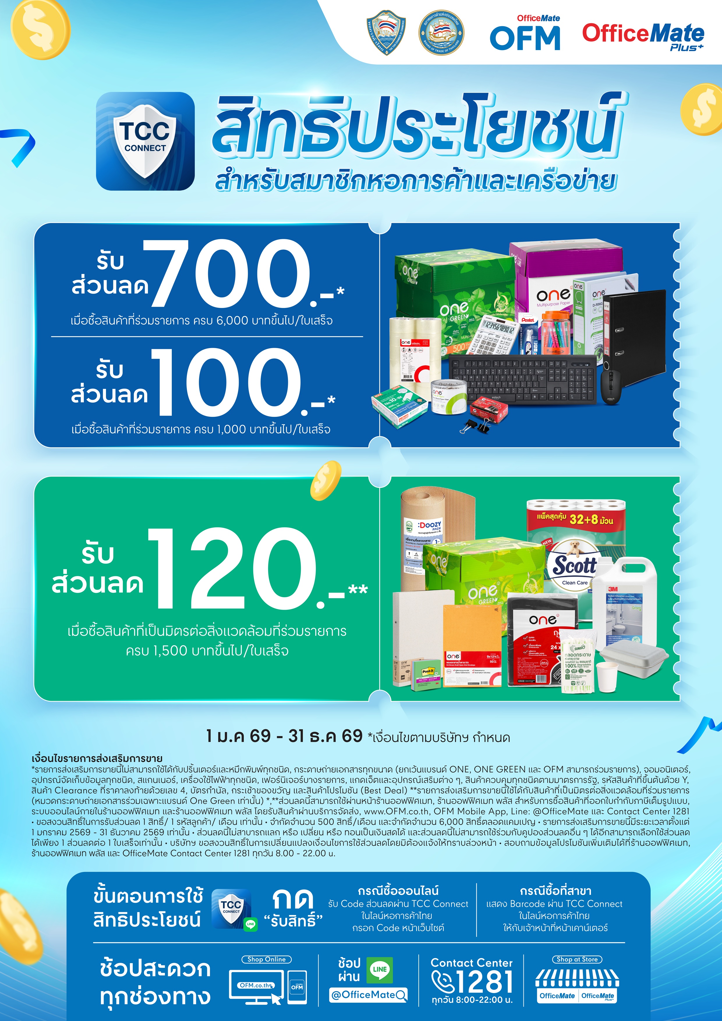- ส่วนลดนี้สามารถใช้ผ่านหน้าร้านออฟฟิศเมท, ร้านออฟฟิศเมท พลัส สำหรับการซื้อสินค้าที่ออกใบกำกับภาษีเต็มรูปแบบ, ระบบออนไลน์กายในร้านออฟฟิศเมท และร้านออฟฟิศเมท พลัส โดยรับสินค้าผ่านบริการจัดส่ง, www.OFM.co.th, OFM Mobile App, Line: @OfficeMate และ Contact Center 1281