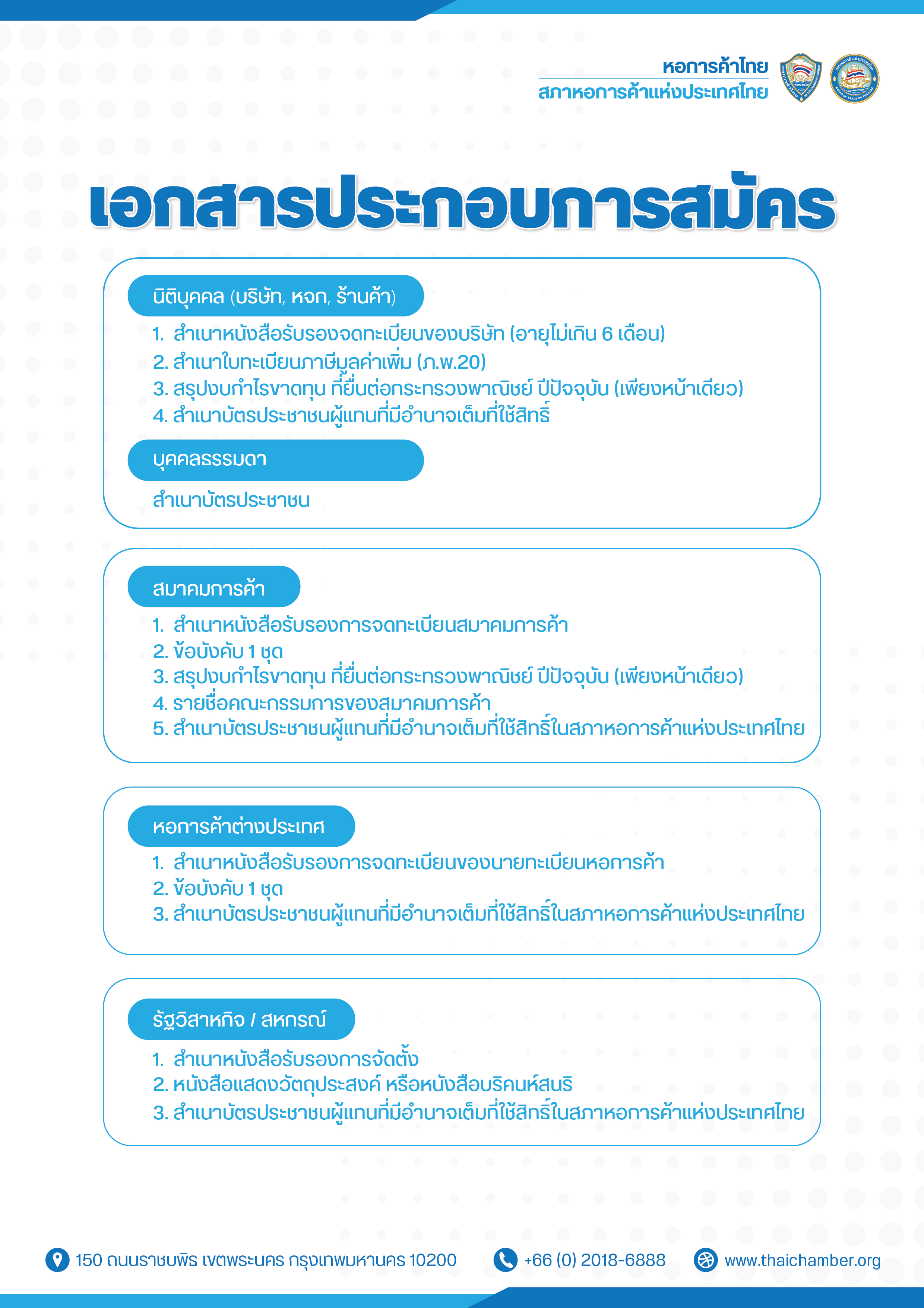 • นิติบุคคลที่ มีสำนักงานใหญ่หรือสาขาอยู่ในต่างจังหวัด และต้องมิได้เป็นสมาชิกของ  หอการค้าจังหวัด / สมาคมการค้า  หรือ หอการค้าต่างประเทศใด ๆ