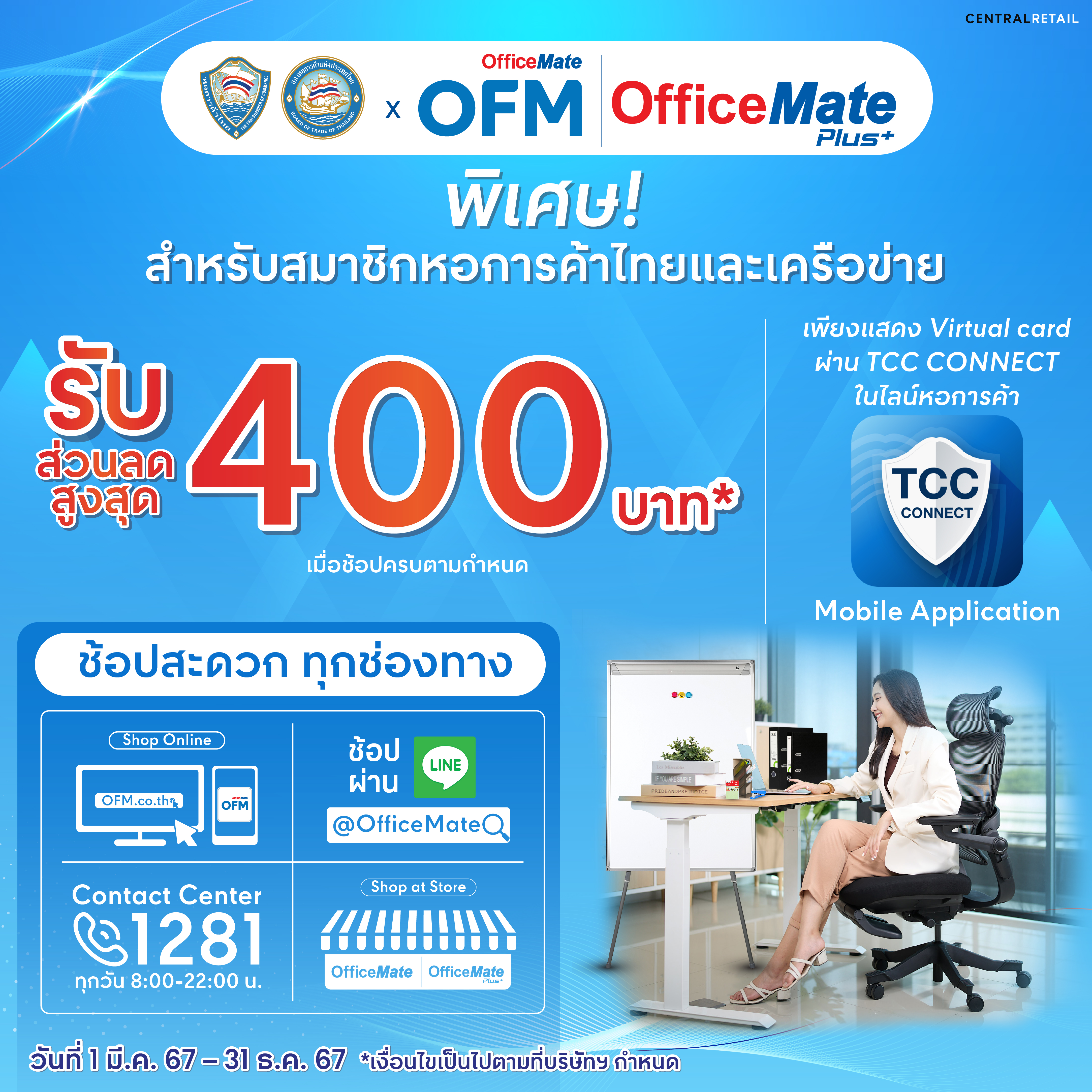 - รับส่วนลด 100 บาท เมื่อซื้อสินค้าที่ร่วมรายการครบ 1,000 บาทขึ้นไป/ใบเสร็จ หรือรับส่วนลด 400 บาท เมื่อซื้อสินค้าที่ร่วมรายการครบ 5,000 บาทขึ้นไป/ใบเสร็จผ่าน www.OFM.co.th, OFM Mobile App, LINE @OfficeMate, Contact Center 1281, ร้านออฟฟิศเมท และระบบออนไลน์ภายในร้านออฟฟิศเมท โดยรับสินค้าผ่านบริการจัดส่งเท่านั้น โดยกดรับโค้ดจาก TCC Connect ในไลน์หอการค้าไทย