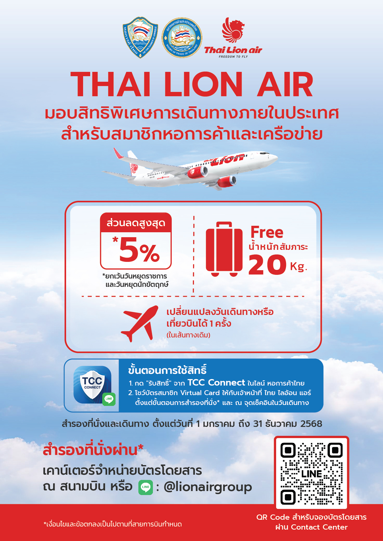 •    การสำรองที่นั่งผ่านช่องทาง Line Official Account พิมพ์ Line ID: @lionairgroup เลือก “ติดต่อเจ้าหน้าที่” พร้อมแจ้งว่า ขอสำรองที่นั่งสำหรับหอการค้าและเครือข่าย ในวันเวลาทำการ วันจันทร์ถึงวันศุกร์ เวลา 08:30 - 17:30 น. ผู้โดยสารจะต้องแจ้งข้อมูลบัตรประจำตัวประชาชนและแนบหลักฐานการเป็นสมาชิกหอการค้าและเครือข่าย Virtual Card ผ่าน TCC Connect ในไลน์หอการค้าไทย ต่อเจ้าหน้าที่ของสารการบิน โดยมีค่าธรรมเนียม การดำเนินการจองบัตรโดยสาร 107 บาทต่อท่าน (รวมภาษีมูลค่าเพิ่ม) และรับชำระเงินเฉพาะบัตรเครดิตเท่านั้น