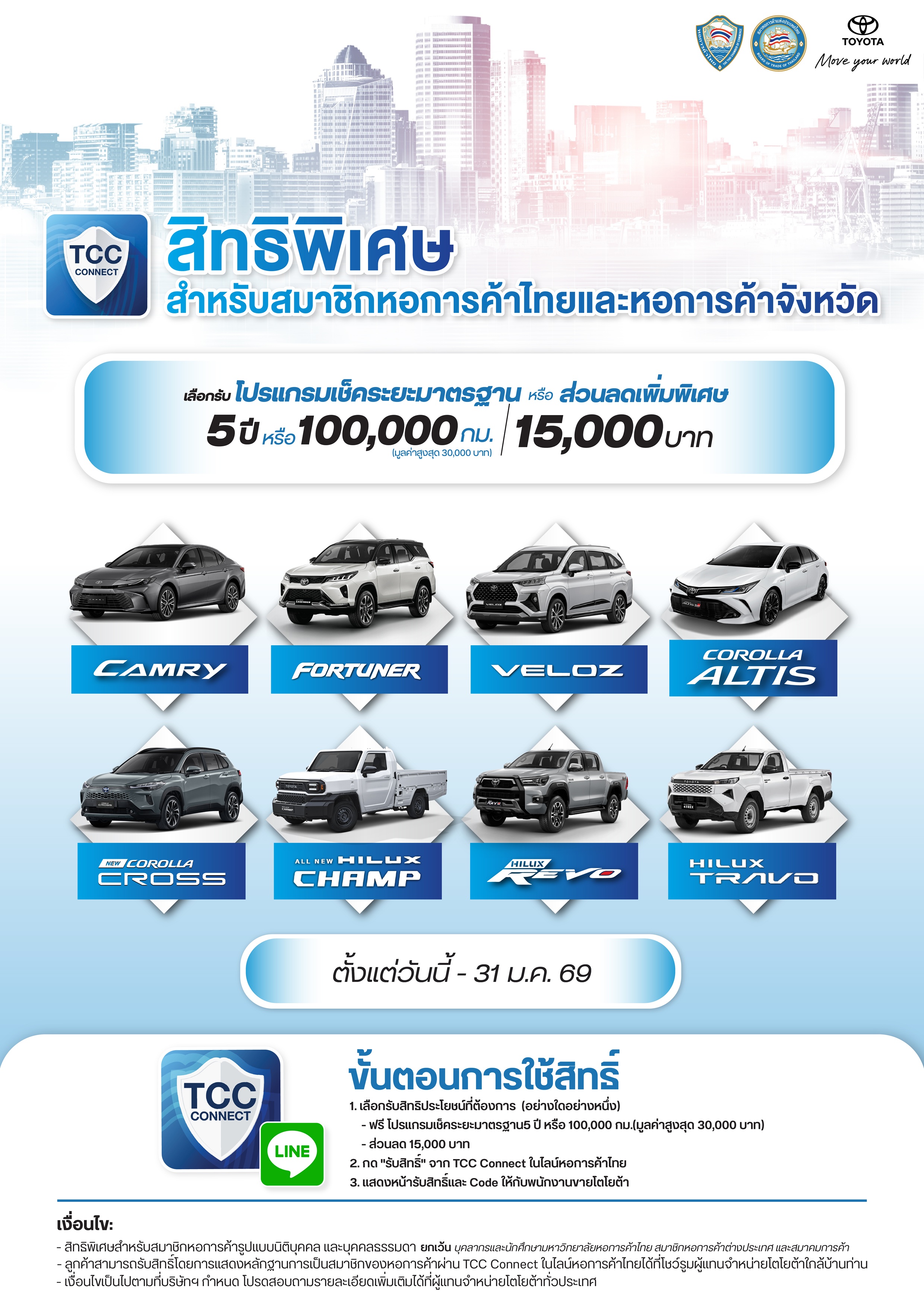 - ลูกค้าสามารถรับสิทธิ์โดยการแสดงหลักฐานการเป็นสมาชิกของหอการค้า ผ่าน TCC Connect ในไลน์หอการค้าไทย ได้ที่โชว์รูมผู้แทนจำหน่ายโตโยต้าใกล้บ้านท่าน