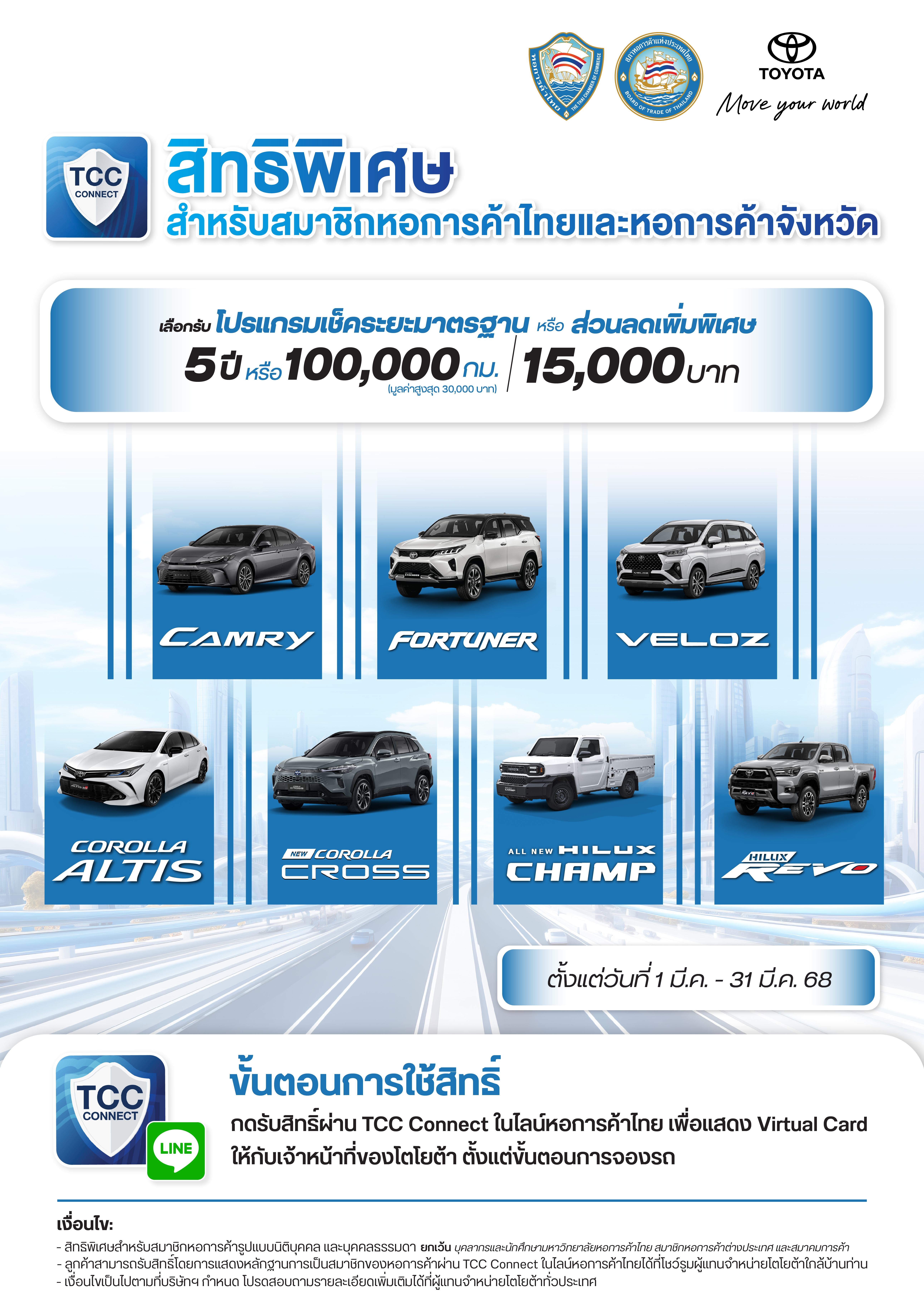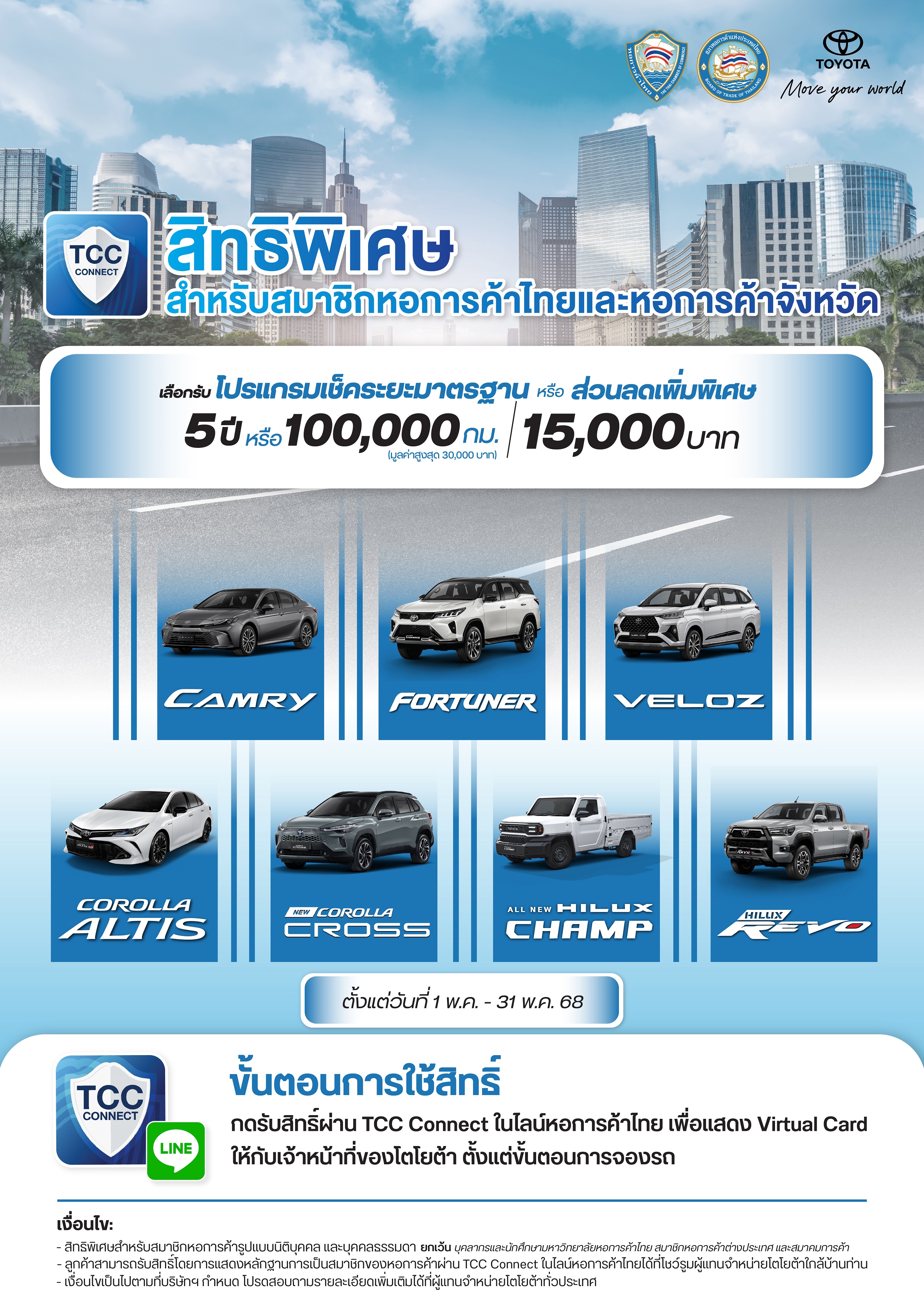 - ลูกค้าสามารถรับสิทธิ์โดยการแสดงหลักฐานการเป็นสมาชิกของหอการค้า ผ่าน TCC Connect ในไลน์หอการค้าไทย ได้ที่โชว์รูมผู้แทนจำหน่ายโตโยต้าใกล้บ้านท่าน