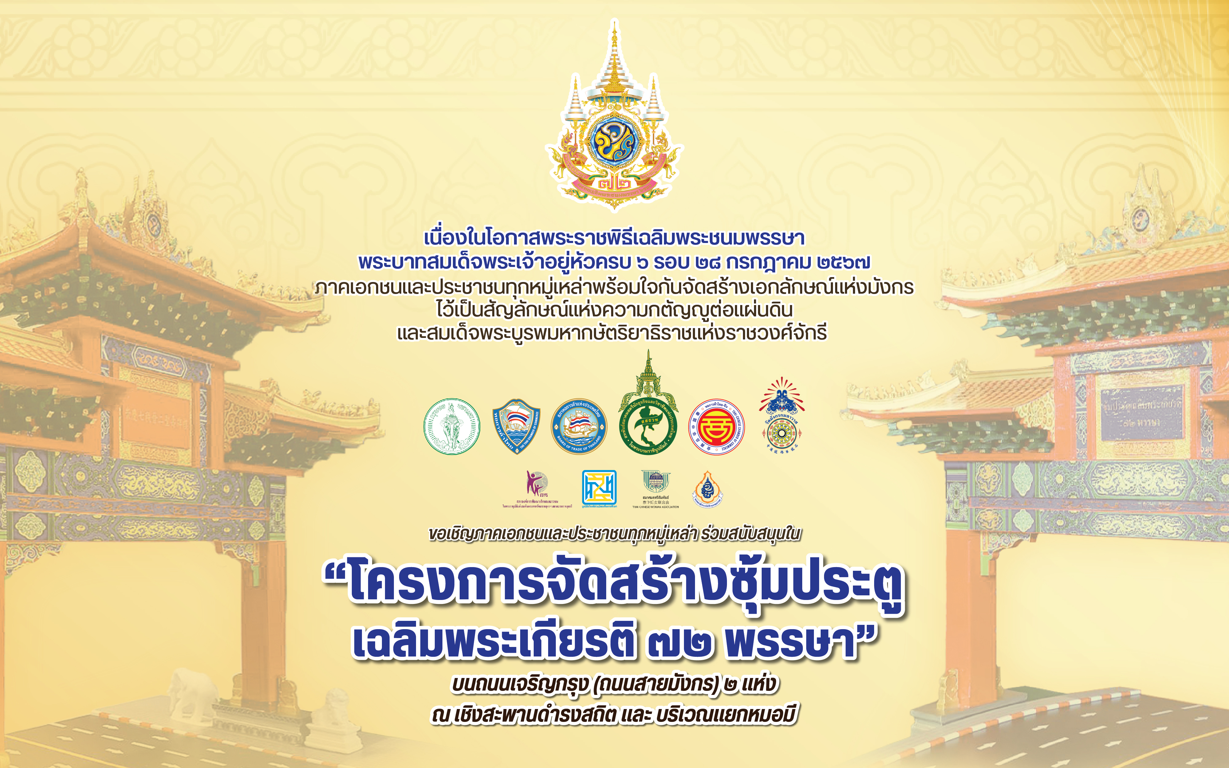 พระบาทสมเด็จพระเจ้าอยู่หัว พระราชทานทุนทรัพย์เป็นทุนประเดิมจัดสร้างซุ้มประตูเฉลิมพระเกียรติ 72 พรรษา 28 กรกฎาคม 2567 เป็นเงินจำนวน 10 ล้านบาท โดย คุณสนั่น อังอุบลกุล ประธานกรรมการหอการค้าไทยในฐานะประธานคณะกรรมการอำนวยการจัดสร้างซุ้มประตูเฉลิมพระเกียรติฯ สายหอการค้าไทยและสภาหอการค้าแห่งประเทศไทย พร้อมด้วย คุณหญิงณัฐิกา วัธนเวคิน อังอุบลกุล, ดร.พจน์ อร่ามวัฒนานนท์ รองประธานกรรมการคนที่ 1,คุณไพรัช บูรพชัยศรี รองประธานกรรมการ, คุณอธิป พีชานนท์ รองประธานกรรมการ, ดร.กฤษณะ วจีไกรลาศ กรรมการเลขาธิการ ร่วมเข้าเฝ้าฯทูลละอองธุลีพระบาท กราบบังคมทูลรายงาน การจัดสร้างซุ้มประตูเฉลิมพระเกียรติฯ