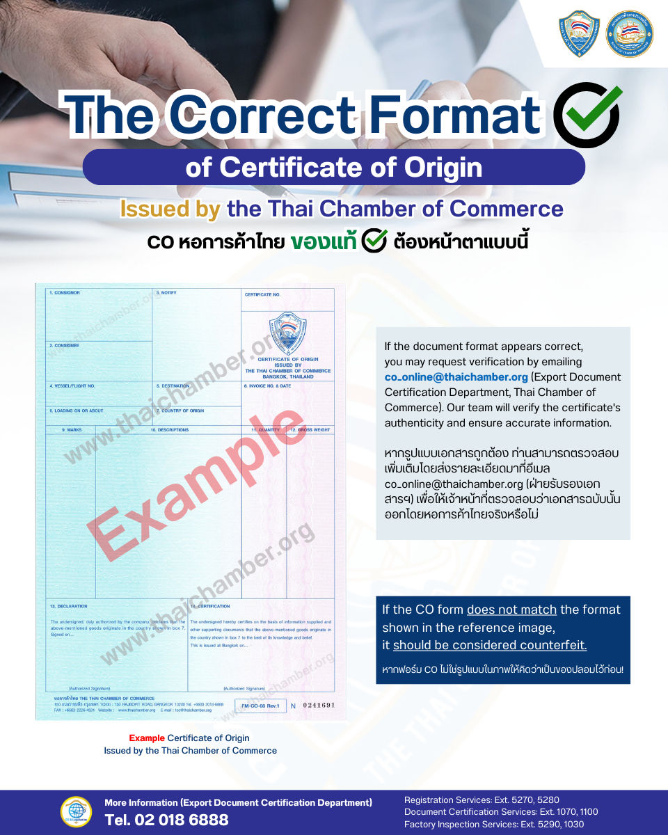 หากท่านมีข้อสงสัยเกี่ยวกับความถูกต้องของเอกสาร โปรดติดต่อ ฝ่ายรับรองเอกสารเพื่อการส่งออก หอการค้าไทย